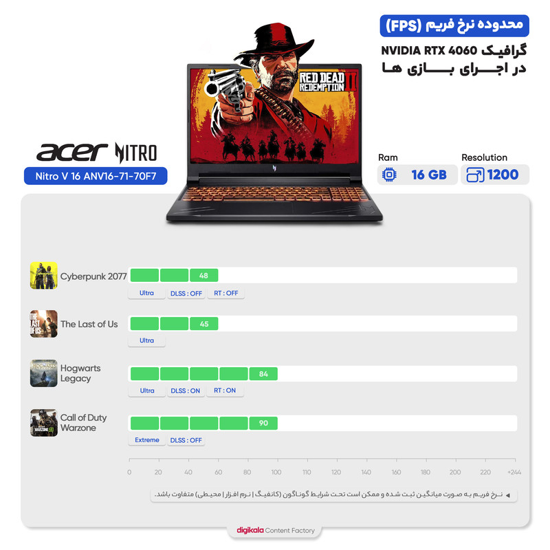 لپتاپ گیمینگ Acer Nitro V 16 ANV16 یک گزینه قدرتمند و مقرونبهصرفه برای گیمرها و کاربران حرفهای است که به دنبال عملکرد بالا در بازیها و پردازشهای سنگین هستند. این دستگاه با پردازنده نسل 14 اینتل Core i7-14650HX و کارت گرافیک RTX 4060 از جدیدترین سختافزارها بهره میبرد تا تجربهای سریع و روان ارائه دهد. نمایشگر 16 اینچی این مدل با وضوح WUXGA، نرخ نوسازی 144 هرتز و پنل IPS، کیفیت تصویر بالایی را تضمین میکند. علاوه بر این، نسبت تصویر 16:10 و زاویه دید 170 درجه، تجربه بصری بهتری را در اختیار کاربران قرار میدهد. این ویژگیها باعث میشود که گیمرها و کاربران حرفهای، از نمایش رنگها و نرخ فریم بالا در بازیها و کارهای گرافیکی نهایت لذت را ببرند. بدنه لپتاپ ترکیبی از پلاستیک و پلیکربنات است که علاوه بر مقاومت بالا، باعث کاهش وزن کلی دستگاه شده است. وزن 2.5 کیلوگرم و ضخامت 24.7 میلیمتری، این لپتاپ را در دسته محصولات قابلحمل قرار میدهد. کیبورد با نورپردازی تکرنگ نارنجی، ظاهر گیمینگ این دستگاه را تکمیل میکند. سیستم صوتی DTS:XUltra و وبکم HD 720p با قابلیت حذف نویز، تجربهای عالی برای تماسهای ویدیویی و محتوای چندرسانهای ارائه میدهند. درگاههای ارتباطی این مدل شامل دو درگاه USB-A 3.2 یک درگاه USB-C با پشتیبانی از Thunderbolt 4، خروجی HDMI، جک 3.5 میلیمتری صدا و درگاه شبکه است. همچنین، این لپتاپ از وایفای 6 و بلوتوث 5.1 برای ارتباطات بیسیم بهره میبرد. باتری 57 واتساعتی نیز توانایی شارژدهی حدود 3.5 ساعت را دارد که در صورت استفاده از عملکردهای سنگینتر، ممکن است این میزان کاهش یابد.